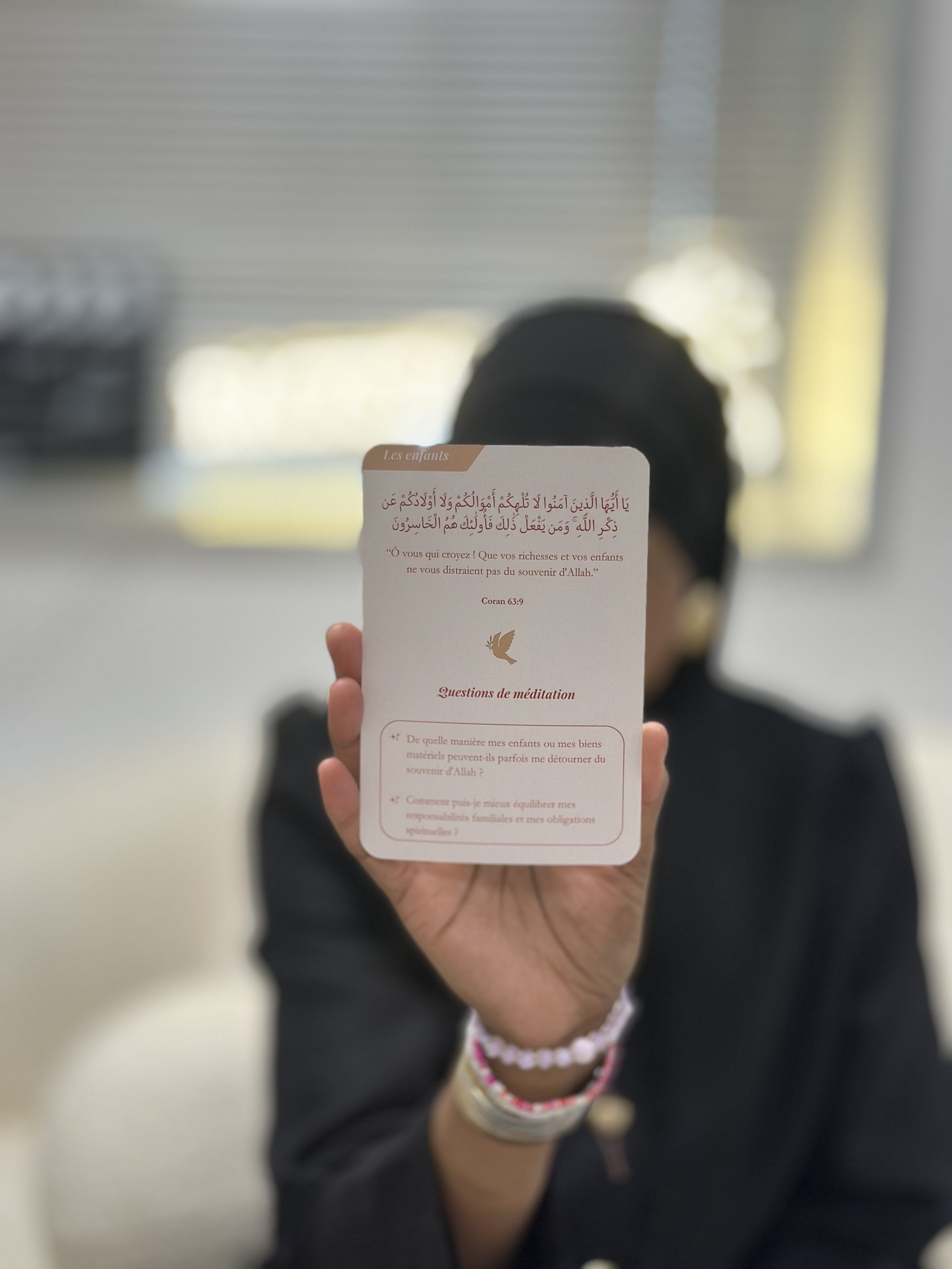 Avec notre jeu de cartes de méditation du Coran. Chaque carte recèle une question réflexive liée à un verset inspirant, vous invitant à explorer les moindres recoins de votre être.